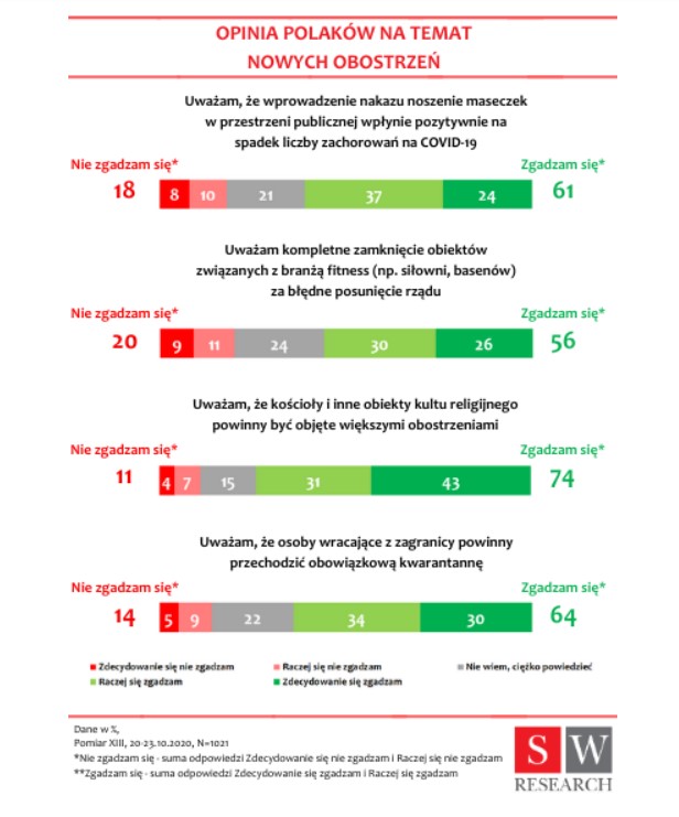 Sześciu na dziesięciu Polaków zgadza się ze stwierdzeniem, że wprowadzenie nakazu noszenia maseczek w przestrzeni publicznej pozytywnie wpłynie na spadek liczby zachorowań na COVID-19 (61%). Przeciwnego zdania jest 18% badanych. Pozostałe działania nie rządu nie spotkały się z podobną aprobatą. Ponad połowa respondentów uważa kompletne zamknięcie obiektów związanych z branżą fitness (np. siłowni, basenów) za błędne posunięcie rządu (56%), a jedynie co piąty uważa wprowadzenie obostrzeń dla tej branży jest dobrą decyzją (20%). Większość Polaków uważa, że kościoły i inne obiekty kultu religijnego powinny być objęte większymi obostrzeniami (74%). Z tym stwierdzeniem nie zgadza się 11% badanych. Polacy wskazali obostrzenie, które powinno zostać wprowadzone – prawie 2/3 respondentów uważa, że osoby wracające z zagranicy powinny przechodzić obowiązkową kwarantannę (64%). Odmiennego zdania jest 14% przebadanych osób.