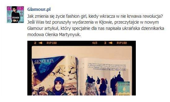 Co najbardziej zdenerowowało czytelników? Fakt zgody na opublikakowanie słabego jakościowo materiału. Autorka, Olenka Martynyuk, opowiadała, jak jej życie zmieniło się po rozpoczęciu się rewolucji na Majdanie. Palone opony stały się „perfumami”, a codzienne problemy nabrały większej wagi: rozterki fashionistki dotyczące odpowiedniego ubioru na Majdan lub co publikować na swoim profilu na FB w czasach rewolucji. Informacje noszące ślady normalnej relacji autorka poprzeplatała z osobistą refleksją: roznoszenie kanapek, o które została poproszona, okazało się wg „próżności” autorki nieodpowiednim zajęciem dla dziennikarki modowej. Na szczęście widok Miss Ukrainy roznoszącej herbatę zadziałał motywująco. Cały materiał wciąż dostępny jest na oficjalnej stronie Glamour. Dodatkowo, Olenka nigdy nie widziała tak dobrze ubranych rewolucjonistów.