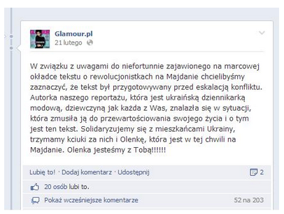 Nie zabrakło oświadczenia samej autorki: „Jest mi niezmiernie przykro z powodu reakcji jaką wywołał mój tekst. Nie chciałam urazić czyichkolwiek uczuć, w szczególności Moich Rodaków na Majdanie, którzy są dla mnie bohaterami. Napisałam ten artykuł trzy tygodnie przed tym, jak zostali zabici pierwsi protestujący, a dzisiejszy pełen strachu i krwi Majdan był pełen nadziei na inne – nie siłowe rozwiązania. W imieniu walczących Ukraińców chciałabym podziękować wszystkim Polakom za pomoc i wsparcie w tym trudnym dla nas momencie.”