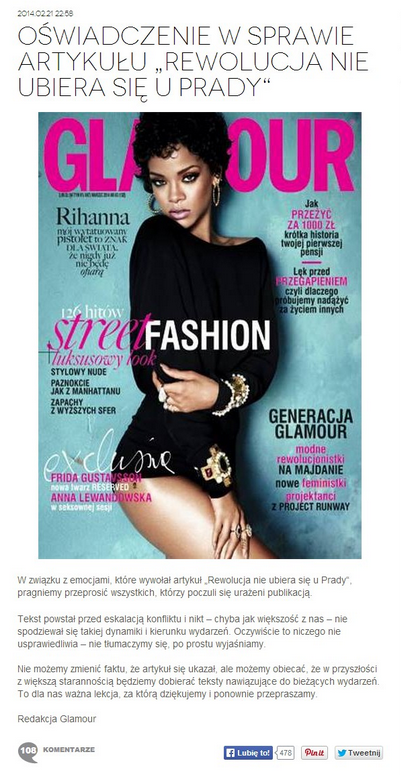Głosów krytyki nie ma końca. Negatywne komentarze możemy czytać pod artykułem na stronie Glamour, pod postami na profilu oficjalnym magazynu czy pod oficjalnymi przeprosinami. Te ostatnie również zasługują na uwagę – wielu krytykujących to właśnie te przeprosimy skłoniły do jeszcze ostrzejszych komentarzy.