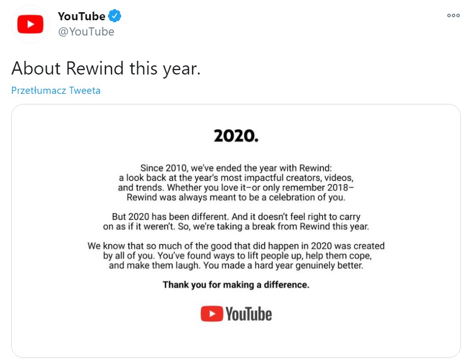 W oświadczeniu przedstawiciele platformy wspomnieli o 2018 roku nie bez powodu – wtedy wówczas ukazał się niesławny YouTube Rewind 2018, który został głośno skrytykowany przez użytkowników platformy. Dlaczego? Otóż, zdaniem internautów, YouTube pominął wiele istotnych wydarzeń i aż nadto skupił się na influencerach i markach. Wideo zgromadziło ponad 18 mln łapek w dół i stało się jednym z najmniej lubianych materiałów, który pojawił się na platformie od początku jej istnienia.