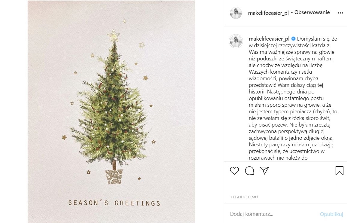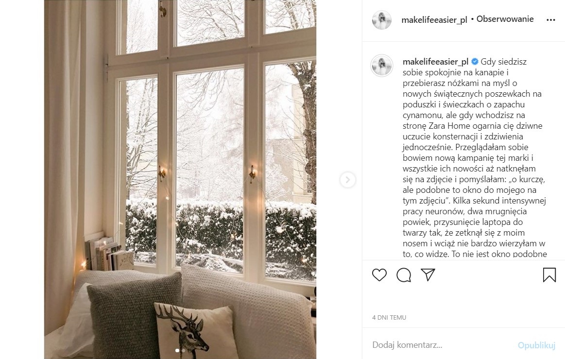 „Gdy siedzisz sobie spokojnie na kanapie i przebierasz nóżkami na myśl o nowych świątecznych poszewkach na poduszki i świeczkach o zapachu cynamonu, ale gdy wchodzisz na stronę Zara Home ogarnia cię dziwne uczucie konsternacji i zdziwienia jednocześnie. Przeglądałam sobie bowiem nową kampanię tej marki i wszystkie ich nowości aż natknęłam się na zdjęcie i pomyślałam: »o kurczę, ale podobne to okno do mojego na tym zdjęciu«. Kilka sekund intensywnej pracy neuronów, dwa mrugnięcia powiek, przysunięcie laptopa do twarzy tak, że zetknął się z moim nosem i wciąż nie bardzo wierzyłam w to, co widzę. To nie jest okno podobne do mojego – pomyślałam – to JEST moje okno” – post o takiej treści pojawił się na instagramowym profilu MakeLifeEasier, należącym do Kasi Tusk. Popularna blogerka zaznaczyła tym samym, że nikt z marki nie skontaktował się z nią wcześniej w sprawie wykorzystania zdjęcia – zostało ono więc użyte bez jej zgody.