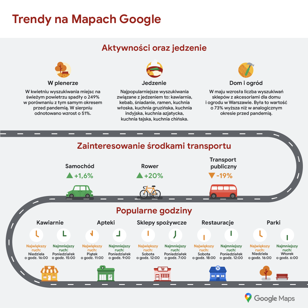 Dodatkowo, firma Google opublikowała infografikę, na której znajdują się informacje i dane dotyczące trendów jakie zaobserwowano na Mapach Google w Polsce w czasie pandemii, takich jak np. najczęściej wybierane środki transportu czy najpopularniejsze wyszukiwania związane z jedzeniem.