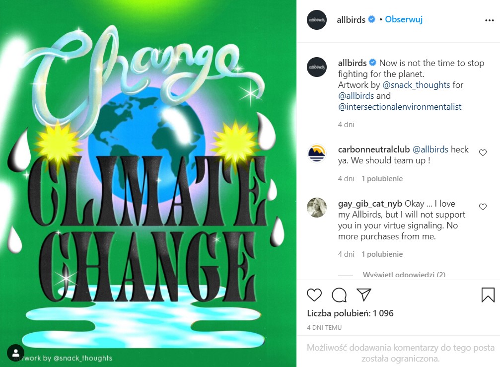 Walczyć z tym postanowiła nowozelandzka marka Allbirds, która oferuje ubrania oraz obuwie wykonane z materiałów przyjaznych dla środowiska. Z okazji tegorocznego Black Friday brand postanowił podnieść o jednego dolara ceny swoich produktów. Natomiast pieniądze zebrane ze swego rodzaju nadwyżki cenowej zostaną przekazane na wsparcie międzynarodowego ruchu Fridays for Future, zainicjowanego przez aktywistkę Gretę Thunberg.