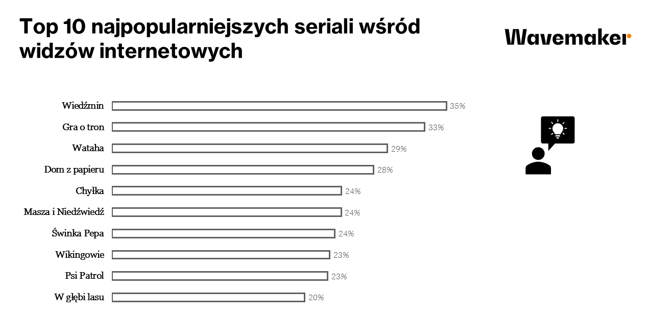 Wśród największych serialowych hitów 2020 r. wyróżniają się „Wiedźmin” (serial premierę miał pod koniec 2019 r.) oraz „Gra o tron”, od lat wielki hit wśród polskich widzów. Wavemaker badał popularność seriali w oparciu o listę produkcji przygotowaną przez Parrot Analytics, agencję monitorującą popularność seriali w internecie, uzupełnioną o najważniejsze lokalne produkcje.