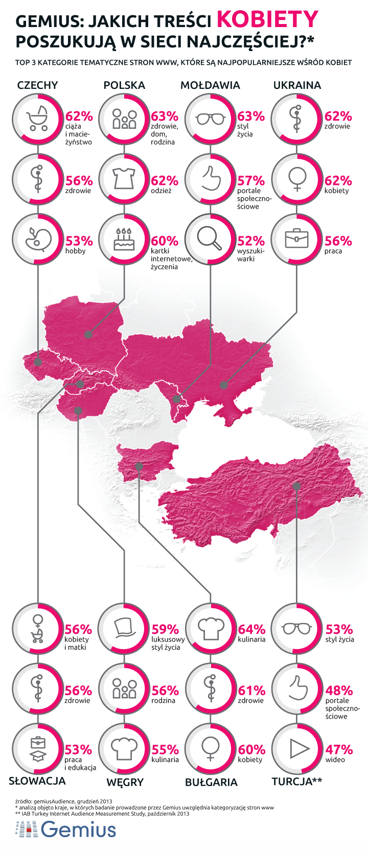 Serwisy dla kobiet, poświęcone ciąży i macierzyństwu, są najpopularniejsze w Czechach (62 proc. internautów odwiedzających te portale to kobiety) i na Słowacji (56 proc.). Styl życia to temat numer jeden wśród użytkowniczek sieci z Mołdawii (63 proc.) i Turcji (53 proc.). Z kolei strony z przepisami kulinarnymi przyciągają największą uwagę Bułgarek (64 proc.), a internautki z Ukrainy w sieci szukają przede wszystkim przepisu na zdrowie (62 proc.). Na Węgrzech tematem, który cieszy się największym zainteresowaniem jest luksus. Niemal 59 proc. użytkowników stron z tej kategorii tematycznej to kobiety.