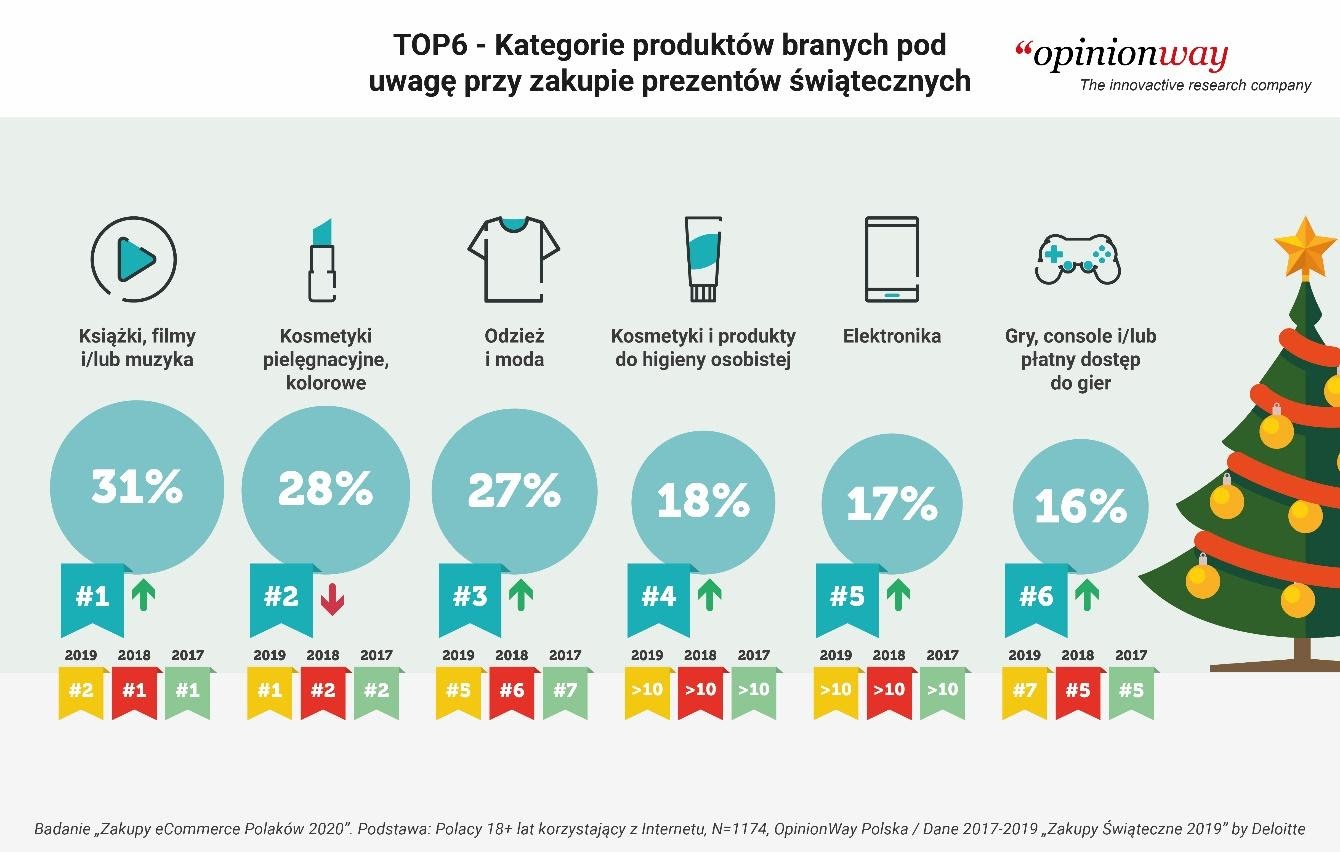 W tym roku nasze świąteczne podarunki będą jednak nieco inne niż rok temu. Pandemia spowodowała, że lista kupowanych upominków zmieniła się ze względu na nowy tryb w jakim żyjemy. Popularność zdobywają te kategorie, które urozmaicą nam czas spędzany w domu. Tygodnie spędzone w domu w pierwszej fazie pandemii spowodowały, że odkrywamy, iż tutaj też może być fajnie. Chwile spędzone z rodziną stały się bardziej jakościowe. Myślimy o tym, czym umilić sobie wspólne godziny z rodziną. Zauważamy, że topową kategorią planowaną w tym roku, jako prezent kupiony online są książki, film i muzyka (31%). Inne popularne kategorie to w kolejności kosmetyki i perfumy (28%) oraz odzież i moda (27%). W roku ubiegłym kosmetyki znajdowały się na pierwszym miejscu planowanych prezentów świątecznych.