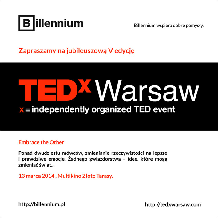 Billennium wspiera ciekawe inicjatywy, dlatego w tym roku po raz kolejny sponsorujemy TEDxWarsaw. Na scenie TEDx pojawiają się ciekawi ludzie ze świata nauki, biznesu, sztuki czy rozrywki, którzy dzielą się ze słuchaczami własnymi, często niesamowitymi i inspirującymi historiami. To naturalne, że staliśmy się częścią tego wydarzenia – mówi Bartosz Łopiński, prezes Billennium.