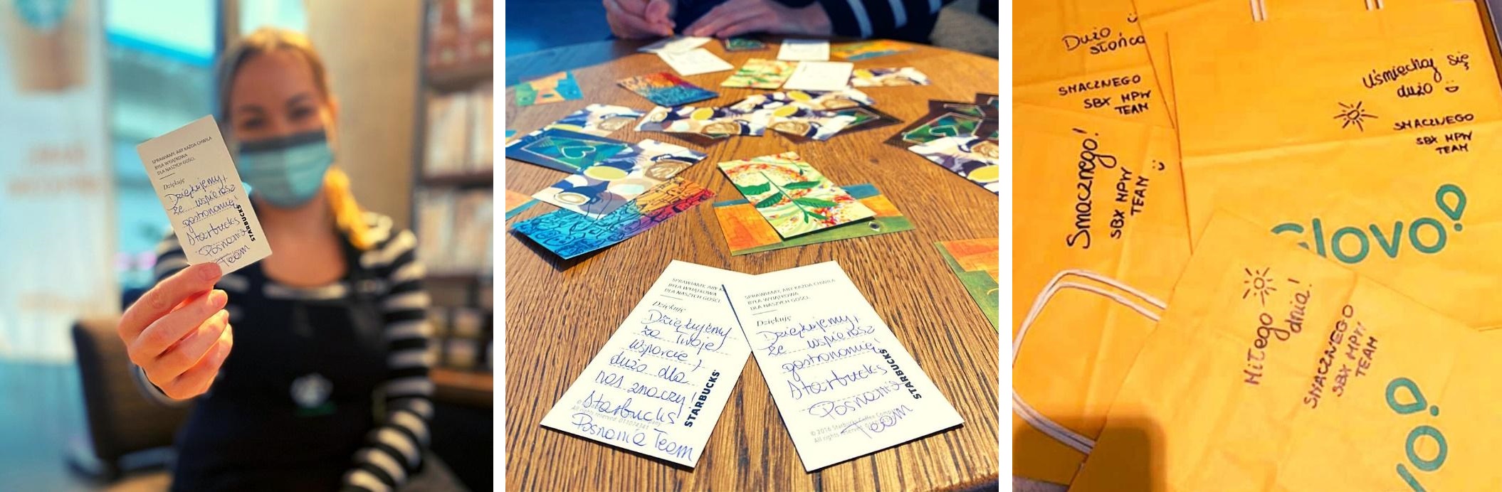 Nie mogę też nie wspomnieć krótko o dwóch innych, mniejszych inicjatywach. W 2020 roku położyliśmy duży nacisk na promocję naszego programu lojalnościowego Starbucks Rewards. Poza tworzeniem dla naszych gości ofert specjalnych, w których mogli zdobywać dodatkowe punkty, w naszym przypadku gwiazdki, zorganizowaliśmy także konkurs, w którym do wygrania był miesiąc „kawy za free”. Konkurs odbywał się na Instagramie, a zadaniem uczestników było zrobienie selfie o tematyce: „Tak spędzam jesień ze Starbucks”. Nagrodą dla 10 osób było aż 30 kuponów na darmowy napój Starbucks. W efekcie różnych działań, pozyskaliśmy wielu nowych, aktywnych użytkowników aplikacji. Bardzo pozytywną i godną uwagi akcją była także zapoczątkowana przez naszych baristów inicjatywa dołączania karteczek z kilkoma ciepłymi słowami do zamówień realizowanych w kanale delivery. Pomysł ten wykorzystaliśmy przy okazji Dnia Życzliwości, kiedy umożliwiliśmy użytkownikom aplikacji Glovo wykonanie miłego gestu w stronę bliskich i podzielenie się z nimi kawą Starbucks wraz z personalizowaną wiadomością – wystarczyło, że przy składaniu zamówienia podali odpowiedni adres i w polu komentarza zamieścili kilka słów, które chcieli, aby nasi bariści zapisali na specjalnych karteczkach. To tzw. Karteczki Zielonego Fartucha, które na co dzień funkcjonują w naszych zespole i służą do doceniania siebie nawzajem.