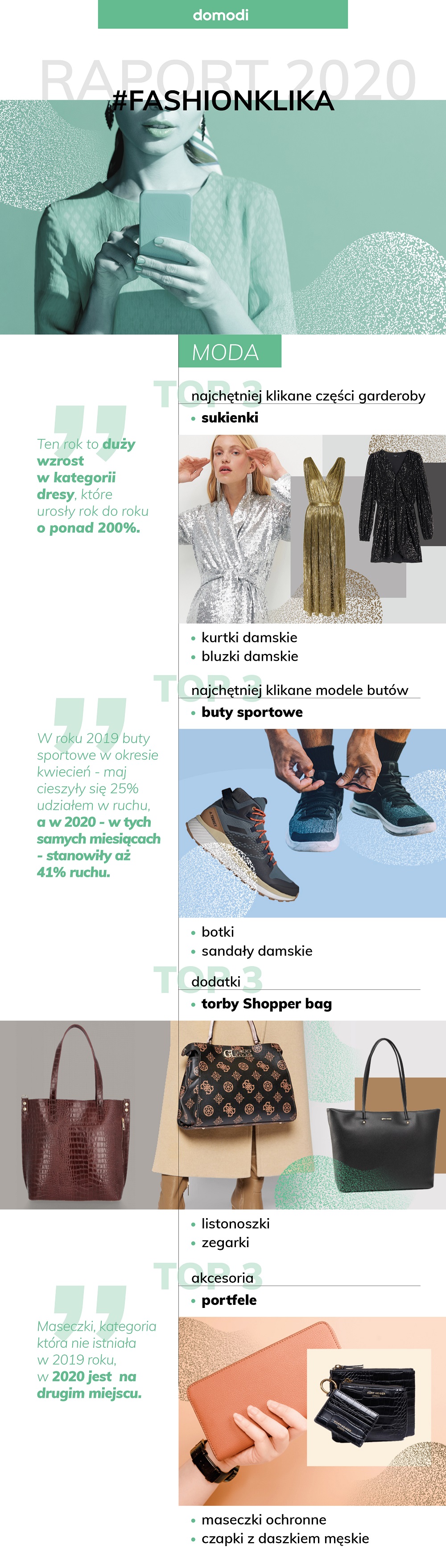 Raport #fashionklika został podzielony na 3 części: Moda. Ludzie. Zakupy. Przedstawia on dane zebrane przez Domodi.pl w okresie od stycznia do grudnia 2020 roku. W tym czasie platformę odwiedzało średnio 4,9 mln użytkowników miesięcznie.
