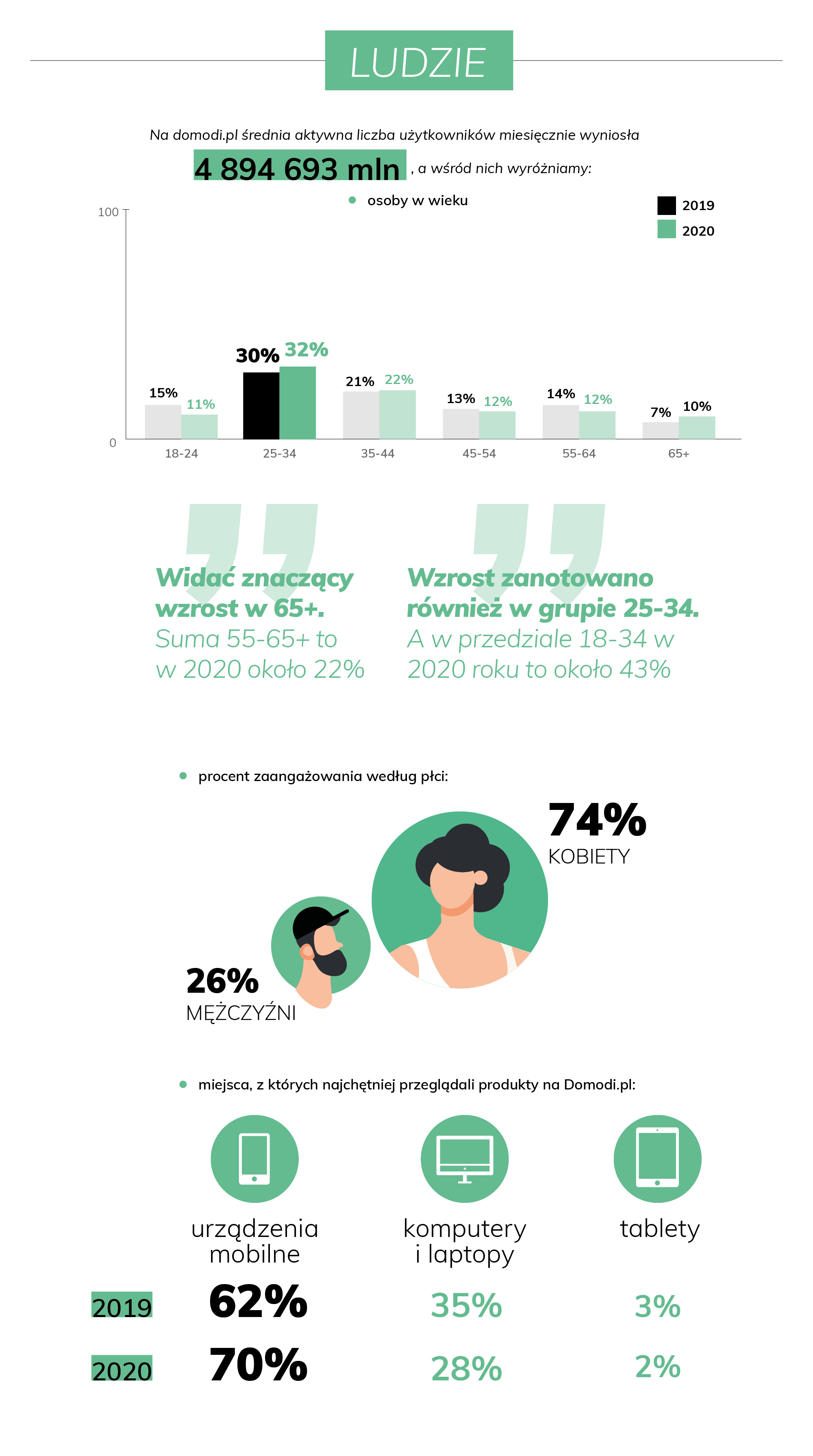 Obok licznych zmian w behawiorze użytkowników na przestrzeni mijającego roku zauważalne były także zmiany w demografii kupujących. Pierwszym, zasadniczym czynnikiem, który zauważyła branża e-commerce jest oczywiście wzrost udziału w ruchu kupujących po 65 roku życia. To właśnie tę grupę najmocniej dosięgła rewolucja e-zakupowa. W przypadku Domodi.pl zauważalnym był także wzrost udziału mężczyzn w całości ruchu na stronie.