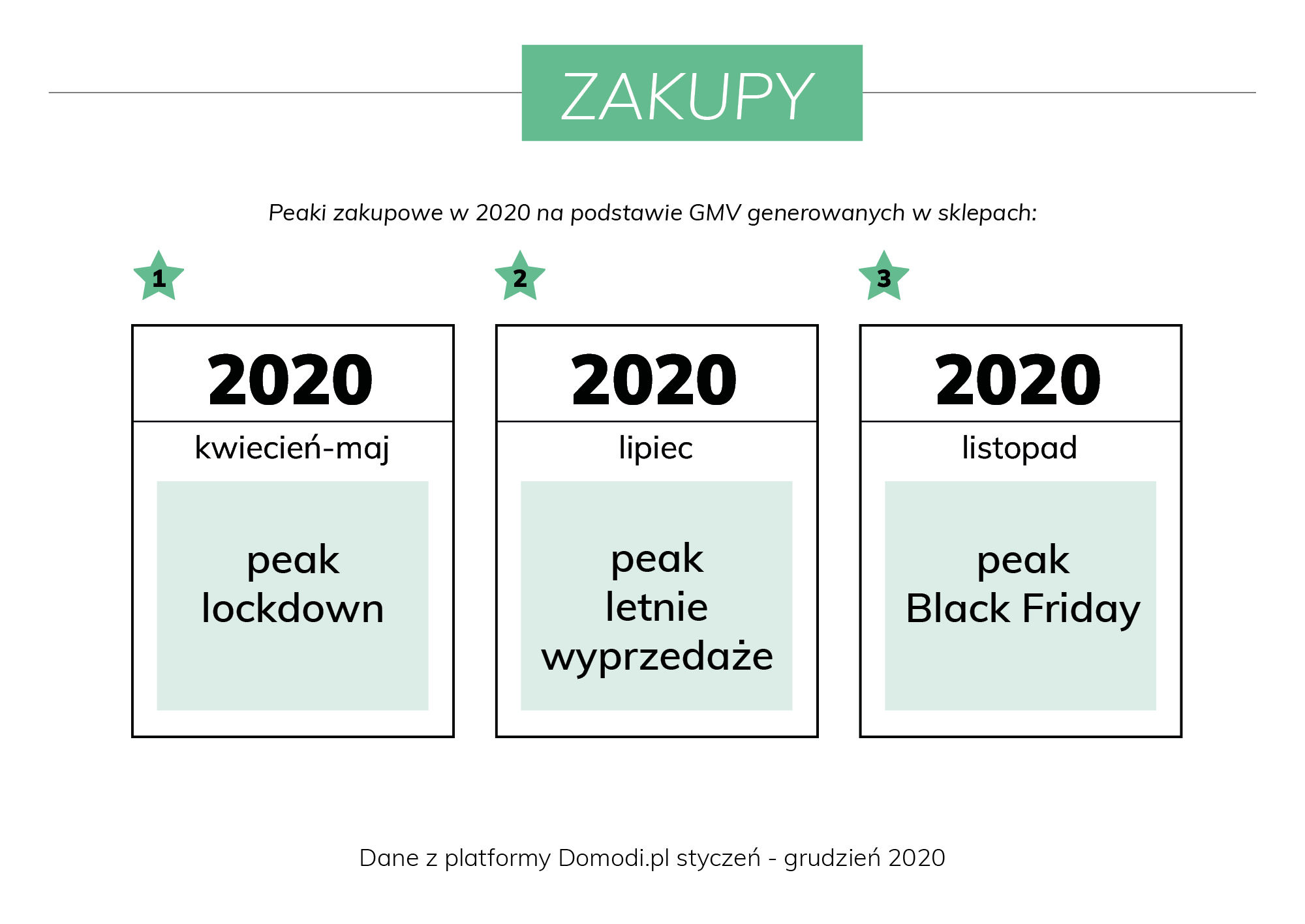 Sama czynność zakupowa również przeszła ewolucję. Jej wersja online stała się tą podstawową i zastąpiła onffline’owe doświadczenia. Dużą zmianę za to rynek fashion zanotował w przypadku peaków zakupowych. Znane dotychczas, trzy największe zakupowe wzrosty notowane były podczas: letnich wyprzedaży, Black Friday oraz okresu świątecznego. 2020 rok zweryfikował tą tendencję, zmieniając kalendarz. Tutaj obok Black Week’a oraz letnich wyprzedaży okresem peakowym okazały się miesiące kwiecień-maj, kiedy to łagodzone były obostrzenia związane z pandemią.