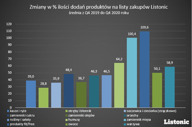 Według raportu „Jak odżywiają się Polacy? Kukuła Healthy Food 2020” już 10% naszych rodaków między 18 a 65 rokiem życia jest wegetarianami. Wiele innych osób natomiast stara się włączać coraz więcej produktów pochodzenia roślinnego do swojej diety. Ta tendencja jest widoczna w analizach list zakupowych Listonic. W ostatnim kwartale 2020 roku dużo częściej niż rok wcześniej planowaliśmy kupno m.in.: humusu (+ 64,21%), orzechów (+ 46,26%), soczewicy i cieciorki (+ 35,92%) czy otrębów oraz błonnika (+ 28,77%). Na popularności w tym okresie zyskały również zamienniki cukru – wzrost o 48,39% r/r. Trend ten pokazują też dane z pierwszych dwóch tygodni stycznia. Zainteresowanie poszczególnymi pozycjami w tym okresie wzrosło rok do roku o 48% w przypadku hummusu, 45,7% – orzechów, 38% – zmienników cukru, 30,4% – otrębów i błonnika, 29,7% – soczewicy i cieciorki.