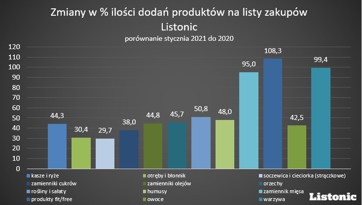 Początek nowego roku to dla wielu z nas czas zmian i postanowień, szczególnie w obecnej sytuacji z nadchodzącym okresem wiążemy duże nadzieje. Pokazują to też analizy list zakupowych Polaków, przeprowadzone przez Listonic – częściej sięgamy m.in. po zdrową żywność, zamienniki mięsa, owoce i warzywa. Co więcej – jest to trend wzrostowy, który rozpoczął się już pod koniec roku 2020. Takie wybory mogą wskazywać na zmiany, które chcemy osiągnąć w swojej sylwetce po długim okresie zamkniętych klubów fitness i konieczności przebywania w domu.