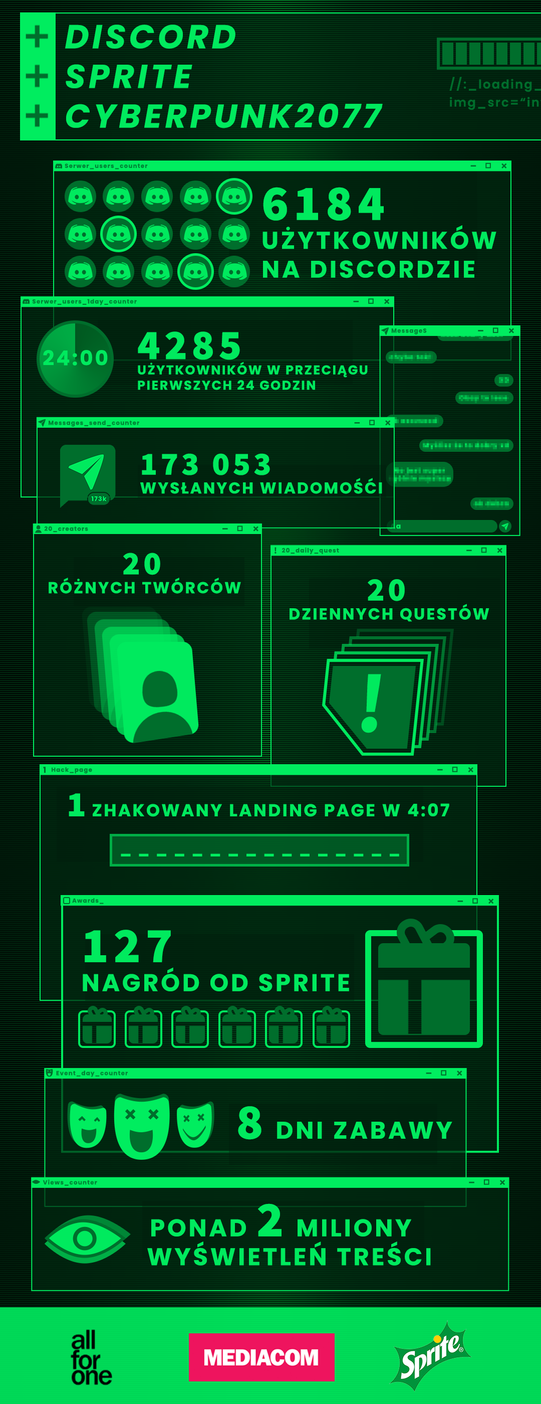 Przez 8 dni fani streamerów łączyli się w drużyny na dedykowanym marce Sprite kanale Discord. To tu zespoły pod wodzą twórców rozwiązywały zadania i podejmowały wyzwania rodem z cyberpunkowej rzeczywistości. Dla zwiększenia zaangażowania każdy fan biorący udział w akcji miał szansę na zdobycie tematycznych nagród, m.in. unikalnych kurtek sygnowanych Cyberpunkiem. Dodatkowo spośród najaktywniejszych uczestników kanału Discord wytypowane zostały 20-osobowe zespoły, które zmierzyły się w walce o nagrodę główną. Finałowym zadaniem było wspólne zhakowanie specjalnie przygotowanego landing page’a zabezpieczonego hasłem.