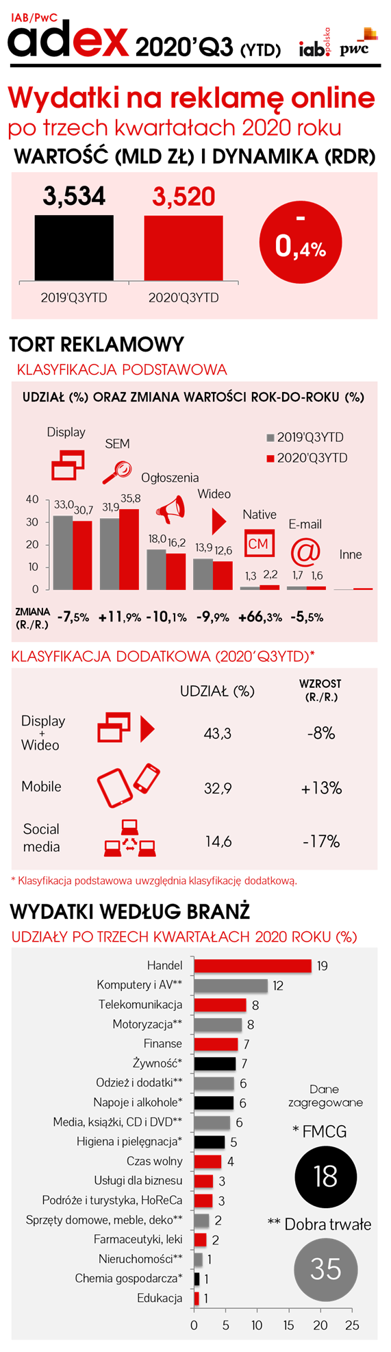 Analizując wyniki badania warto zwrócić także uwagę na kategorię „reklama natywna oraz content marketing”, dotychczas nie prezentowaną w badaniu AdEx. Jej wartość na tyle urosła, że przegoniła pod względem udziału e-mail marketing. W ostatnim podsumowaniu badania została więc wyodrębniona jako oddzielna kategoria w drzewku formatów. Jej dynamika po trzech kwartałach 2020 roku osiągnęła najwyższy wynik spośród wszystkich badanych formatów (+66%). Jest to nominalnie wciąż dość mały segment rynku, jednak przy tempie rozwojowym konsekwentnie sięgającym kilkudziesięciu procent, jego wartość wkrótce będzie liczona w setkach milionów.