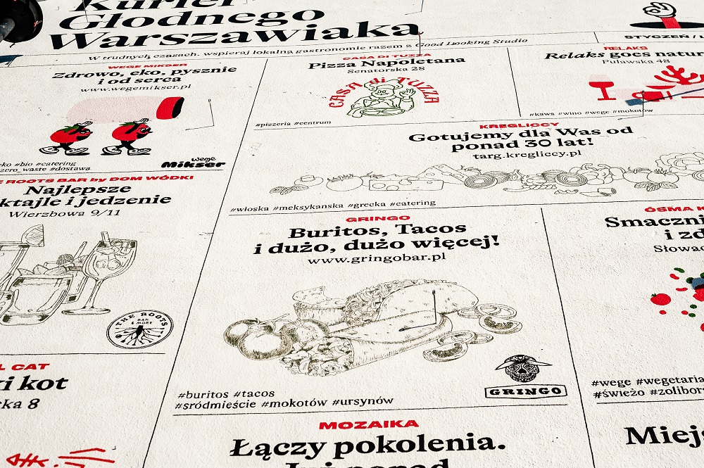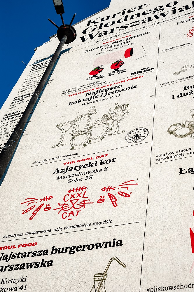 – Stworzyliśmy mural, który ma przypominać stronę ogłoszeniową w gazecie. Zamieszczone na nim anonse promują lokalną gastronomię. Wiele z tych miejsc to lokale naszych przyjaciół, czy też po prostu takie, które lubimy odwiedzać. Ten mural ma jednak wymiar symboliczny, ma zwrócić uwagę na ciężką sytuację rynku restauracyjnego. Zrobiliśmy to pro bono, a naszym celem jest zachęcenie Polaków do wspierania gastronomii w swojej okolicy. Zróbmy to po to, żeby po odmrożeniu gospodarki móc wrócić do naszych ulubionych miejsc – tłumaczy Karol Klepacki z Good Looking Studio.