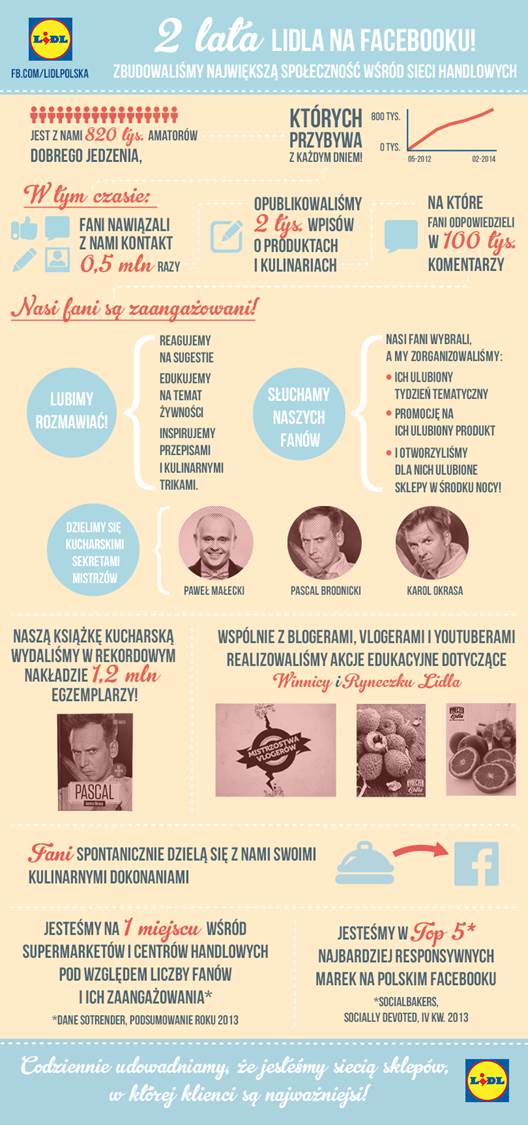 Fanpage Lidl Polska od początku powstania wyznacza standardy obsługi i komunikowania się wśród branży retail, wykorzystując nowe media. Przez ten czas udało się zbudować wokół Lidla największą aktywną i wierną społeczność w branży retail. Za sukcesem stoi umiejętne łączenie oferty produktowej z edukacją kulinarną, a także uważne wsłuchiwanie się w potrzeby konsumentów.