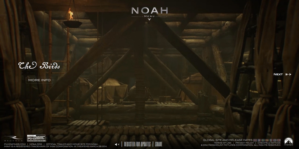 Strona www.noahmovie.com/theark (wersja polskojęzyczna: www.noe-film.pl/arka) została zaprojektowana na planie arki Noego. Użytkownik porusza się po 3-piętrowym, obiekcie, w którym odkrywa kolejne treści – fragmenty filmu, fotosy z planu, kadry z filmu itd. Przestrzeń arki została odtworzona w 3D.