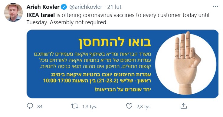 Akcja IKEA trwała zaledwie kilka dni – zakończyła się 23 lutego br. – a do szczepień zachęcał sam premier Izraela, Benjamin Netanjahu.