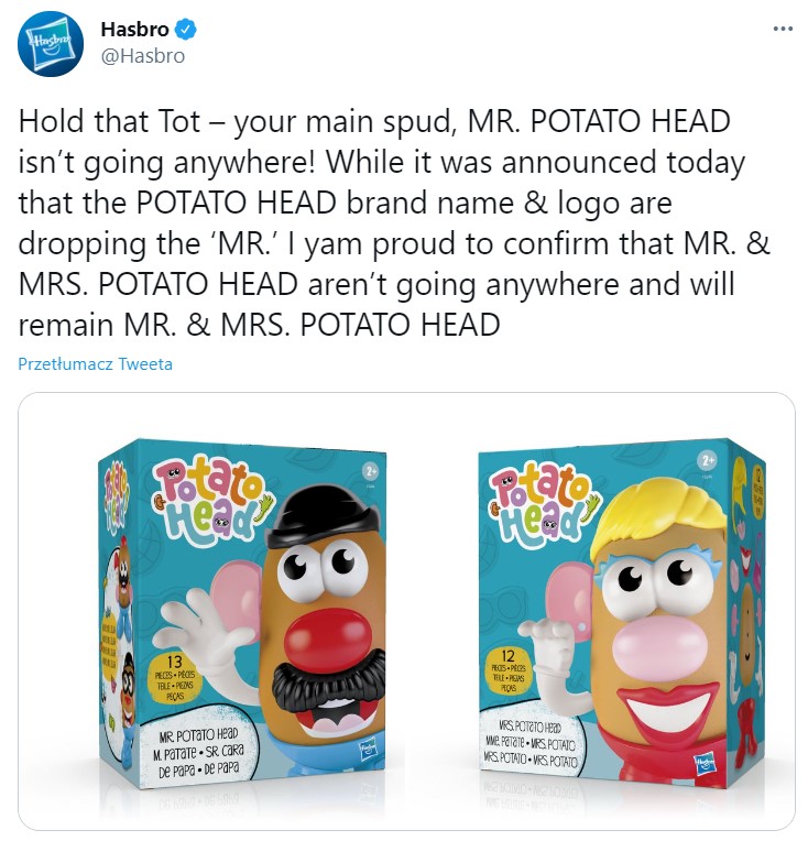 Teraz marka poinformowała, że z nazwy bohatera zniknie przedrostek „Mister”, w związku z czym zabawka nie będzie już miała narzuconej płci. Skąd taka decyzja? Otóż, jak przyznali przedstawiciele Hasbro, zależy im, aby „wszyscy czuli się mile widziani w świecie Potato Head” i jednocześnie chcą promować „równość płci i integrację”.