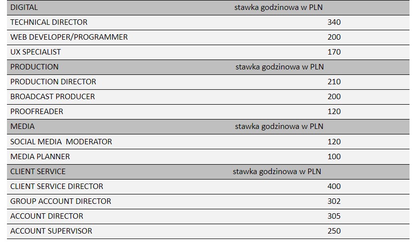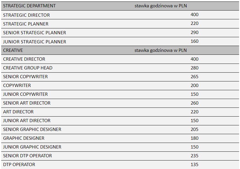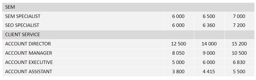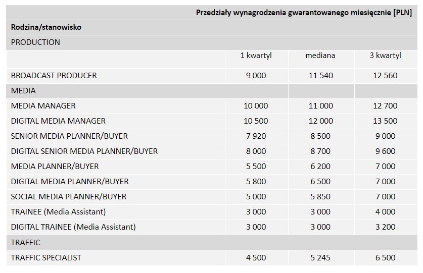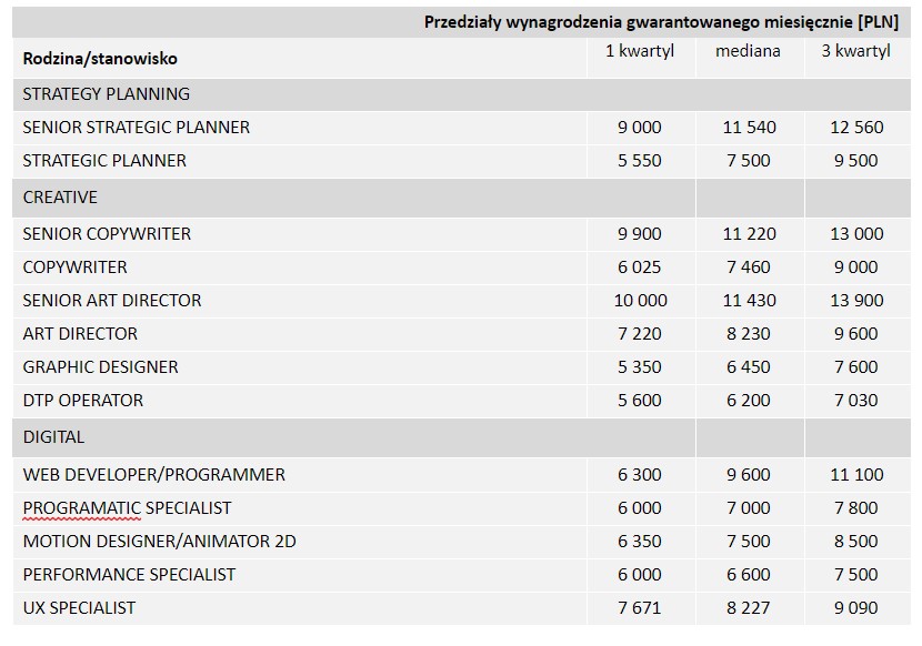 W tabelach poniżej zaprezentowano wartości przeciętnych przedziałów rynkowych wynagrodzeń (rynkowa mediana oraz pierwszy i trzeci kwartyl), dla typowych stanowisk dla branży komunikacji marketingowej, dla płacy gwarantowanej brutto.
