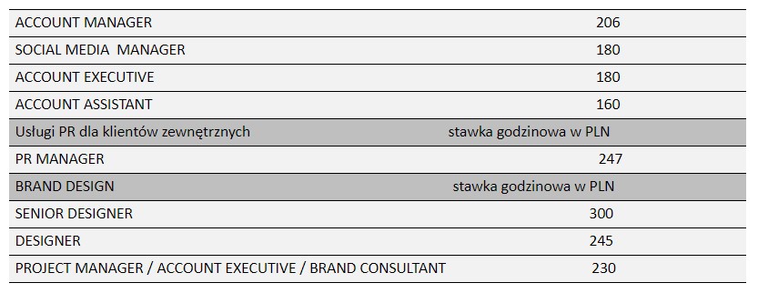 Badanie SAR obejmuje również określenie wartości stawek cennikowych (wg stanu na 1.01.2021), czyli prezentowanych klientom na etapie wyjściowym negocjacji kontraktu. Wartość stawek za godzinę pracy poszczególnych stanowisk jest wyrażona netto (bez VAT) w PLN i fakturowana przez firmę – nie należy więc mylić tej wartości z płacą netto uzyskiwaną przez pracowników.