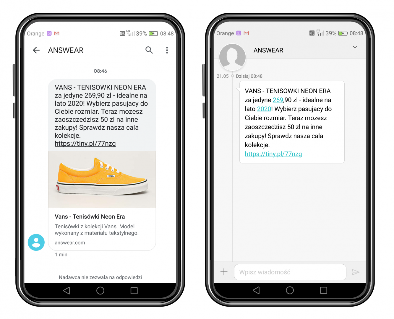 Prezentacja graficzna na przykładzie “Wiadomości Google” ma charakter poglądowy i może się różnić w zależności od aplikacji obsługującej SMS-y. Powyższa wizualizacja jest realnym przykładem pobrania meta danych ze sklepu internetowego, jednak nie stanowi żadnej oferty lub promocji przedstawionych produktów.