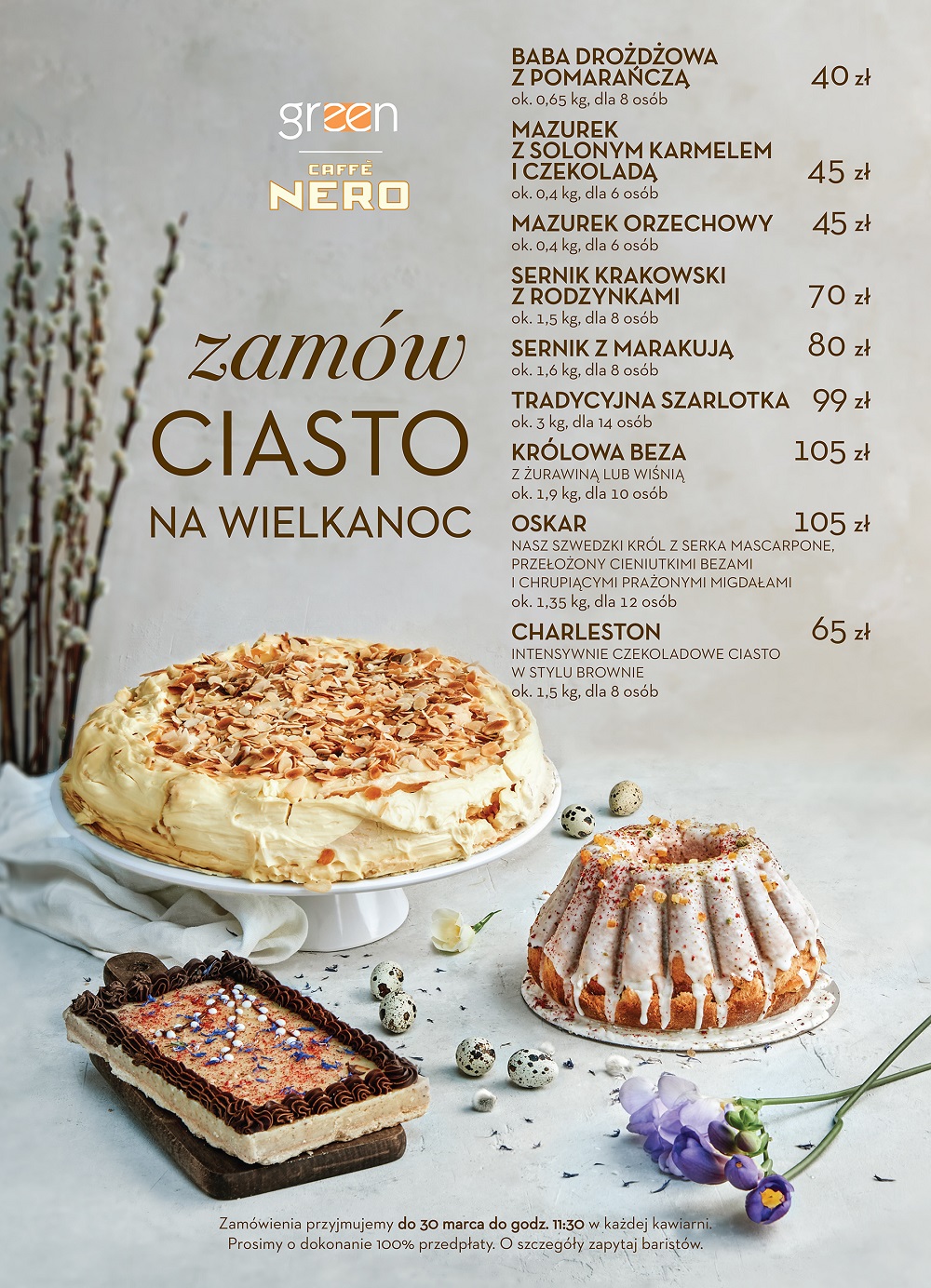 Green Caffè Nero oferuje atrakcyjną cenę na całe ciasta, z góry zapewniając rabat cenowy względem standardowych cen ciast w kawiarni w przeliczeniu na jedną porcję. Zamówienia można składać w każdej kawiarni Green Caffè Nero do godz. 11.30 w dniu 30 marca 2021 roku, a gotowe zamówienia należy odbierać w dniach 2 i 3 kwietnia 2021 roku (Wielki Piątek i Wielka Sobota) w tej samej kawiarni w godzinach jej pracy.