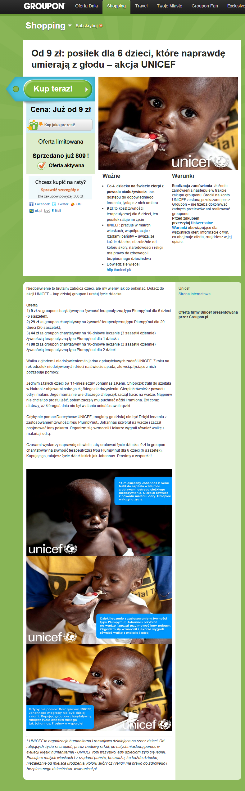 Wśród wielu ofert dostępnych w serwisie zakupowym Groupon pojawiła się jedna naprawdę dobra: obiad dla sześciu osób za 9 zł. To prawdziwa okazja – by pomóc głodującym. Unicef zbiera w ten sposób środki na żywność terapeutyczną dla głodujących dzieci w Czadzie. Wystarczy kliknąć w atrakcyjną ofertę, by przekonać się, jak niewielkim nakładem finansowym i czasowym można wesprzeć szczytny cel.