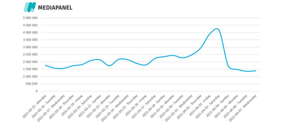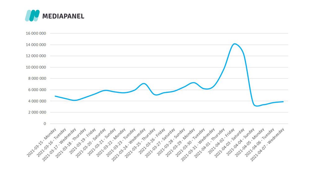 W przypadku liczby odsłon rekord padł w piątek, 2 kwietnia. Tego dnia użytkownicy wygenerowali ich aż 14,1 mln, przy średniej dziennej dla marca wynoszącej 5,3 mln. Wysoka oglądalność utrzymywała się oczywiście również w sobotę, gdy internauci wykonali 12,4 mln odsłon.