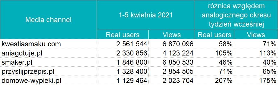 Liderem zestawienia witryn z kategorii „Kuchnia, gotowanie” była w okresie świątecznym kwestiasmaku.pl. Przyciągnęła ona od 1 do 5 kwietnia 2,6 mln użytkowników, którzy wygenerowali w tym czasie 6,9 mln odsłon. To wynik znacząco lepszy niż w analogicznym okresie tydzień wcześniej. Stronami, które mogą pochwalić się największymi wzrostami są natomiast domowe-wypieki.pl (witryna odnotowała 207% zwyżki RU i 175% w przypadku odsłon), oraz aniagotuje.pl, która zdublowała liczbę użytkowników i odsłon w stosunku do poprzedniego tygodnia.