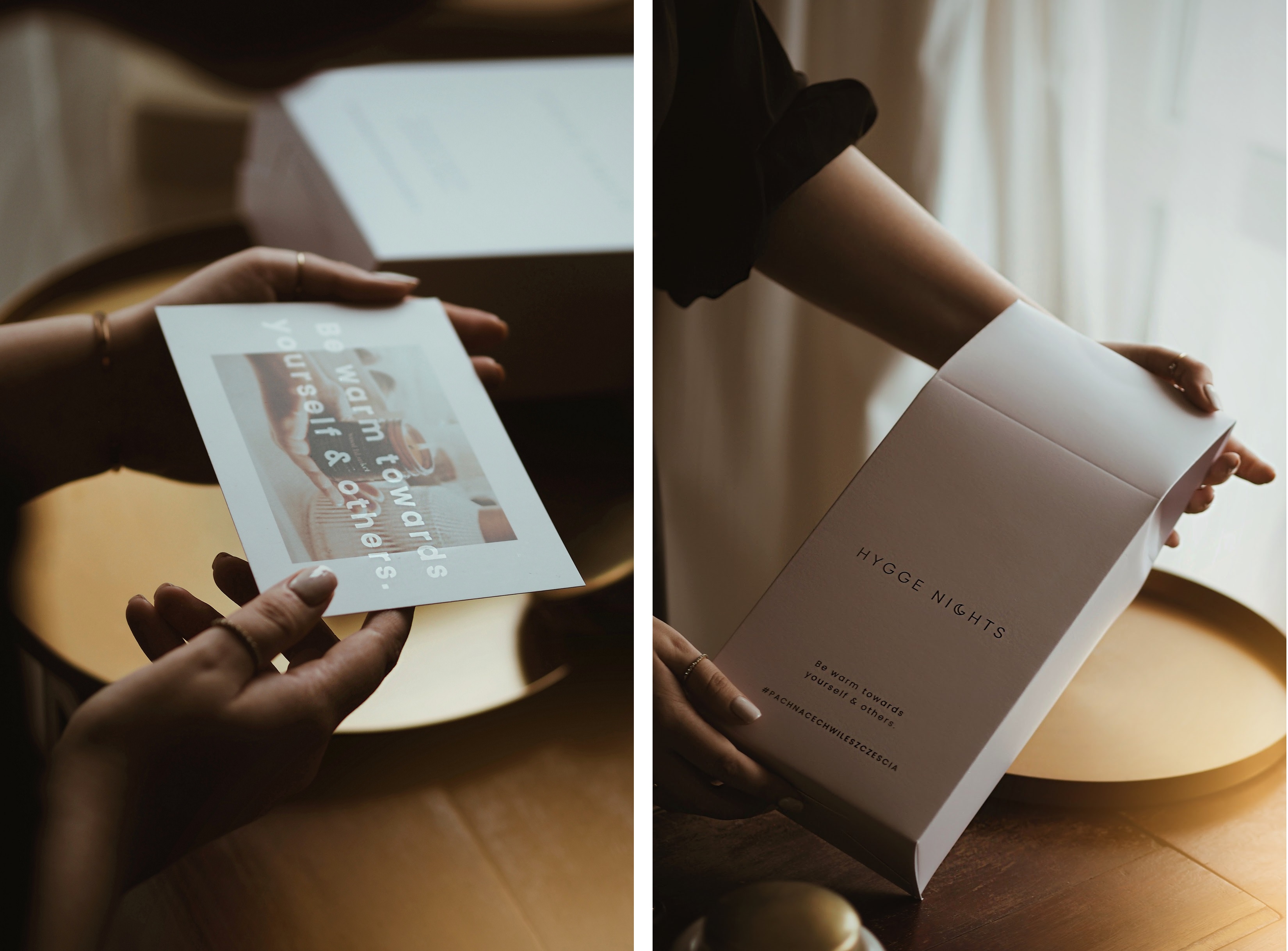 Skąd pomysł na współpracę z Hygge Nights? W drukomat.pl wierzymy, że to, co zostaje przeniesione na papier, pomaga budować pozytywne relacje na styku marka – klient, a wiara ta poparta jest wieloma statystykami i badaniami, które przytaczamy między innymi w tym artykule. Widać to także w popularności naszej akcji #dorzućDOpaczki, której celem jest promowanie poligrafii w e-commerce, dzielenie się know-how oraz dostarczanie autentycznych przykładów na to, że duet papier i digital ma moc większą niż każde z nich w pojedynkę. Jednym z takich przykładów jest właśnie historia partnerstwa z Hygge Nights, w ramach którego powstał zestaw referencyjnych produktów poligraficznych, cieszący klientów, składających zamówienia online.