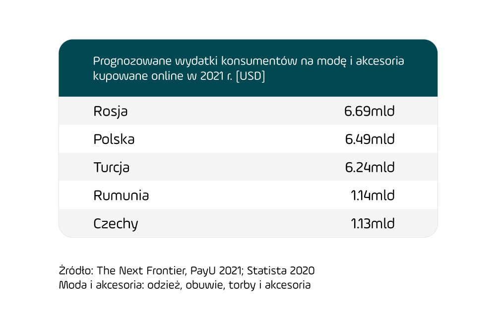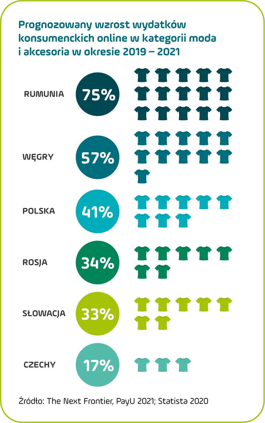 Prognozowany wzrost wydatków online w kategorii moda i akcesoria w latach 2019-2021 plasuje Polskę w środku zestawienia dla regionu i wynosi 41%. Jest to większy wzrost niż w Rosji (34%) czy w Czechach (17%), jednak mniejszy niż na Węgrzech (57%) i w Rumunii (75%). Rumunia zdecydowanie wyróżnia się pod względem tempa wzrostu w tym segmencie i najprawdopodobniej w tym roku wydatki konsumentów na ubrania, obuwie i akcesoria kupowane online przekroczą po raz pierwszy w historii 1 mld dolarów.