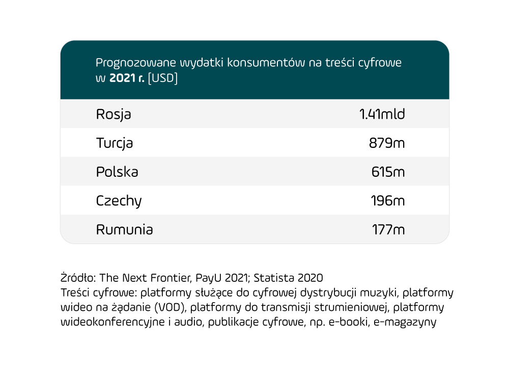 Liczne ograniczenia i zatrzymanie Polaków w domach wpłynęło nie tylko na zwyczaje konsumenckie w korzystaniu z treści cyfrowych, ale także na wyraźny wzrost wydatków w tej kategorii zakupowej. Szacuje się, że do końca 2021 r. konsumenci w Polsce wydadzą na nie 615 mln dolarów, co stanowi wzrost o 39% w porównaniu do wyników za rok 2019 oraz o 14% w porównaniu do 2020 r. Prognozowane wzrosty wydatków na treści cyfrowe w Polsce w latach 2019-2021 są jednakowe jak w Rosji (39%), pomimo znacznych różnic w wielkości rynków konsumenckich obu krajów. 63 miliony kupujących przez internet w Rosji, w porównaniu do 20 milionów w Polsce, może wydać na treści cyfrowe 1,41 mld dolarów do końca bieżącego roku – wynika z analiz. Największych wzrostów w regionie oczekuje się natomiast w Rumunii (54%).