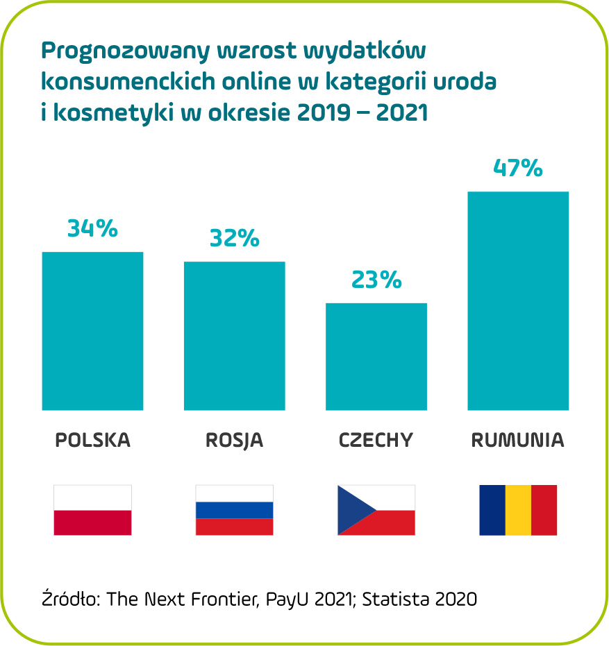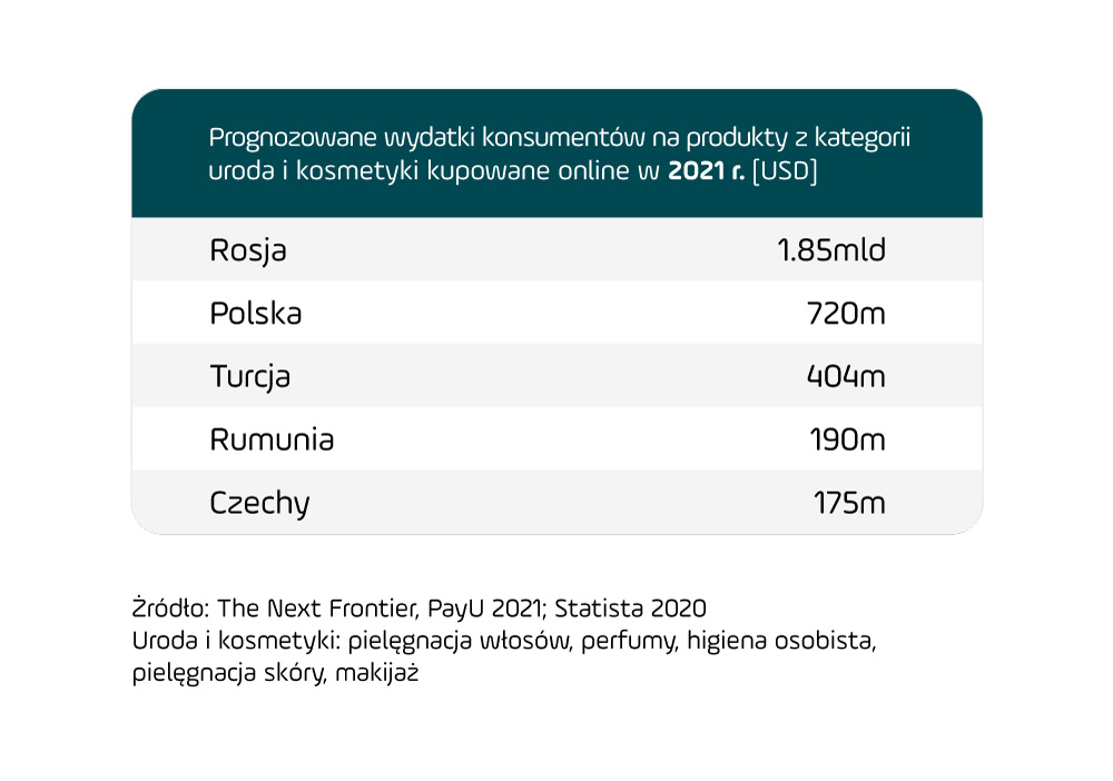 Polscy internauci wydają coraz więcej na produkty oferowane przez e-sklepy z branży beauty & cosmetics – oczekuje się, że do końca 2021 r. wydatki na kosmetyki i inne produkty związane z dbałością o urodę sięgną 720 mln dolarów, co stanowi wzrost o 34% w porównaniu do wyników za rok 2019 oraz o 13% w porównaniu do 2020 r. Prognozowany wzrost wydatków online w Polsce w analizowanej kategorii zakupowej w latach 2019-2021 jest wyższy niż w Rosji (32%) i Czechach (23%), ustępując w regionie jedynie Rumunii (47%).