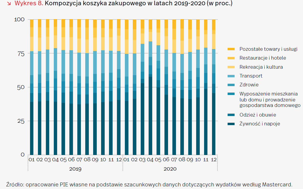 Udział wydatków na zakwaterowanie i gastronomię w koszyku wydatków spadł z 7,1 do 3,8 proc. między 2019 r. a pierwszym kwartałem 2021 r. Okres ten cechował się ograniczoną mobilnością, w konsekwencji czego przychody w transporcie zmalały z 16,7 do 13,6 proc. Zamknięcie galerii handlowych wyraźnie uderzyło w branżę odzieżową. Udział wydatków na odzież i obuwie w koszyku konsumpcyjnym zmalał z 7,5 do 4,7 proc., wydatki te spadły również realnie.