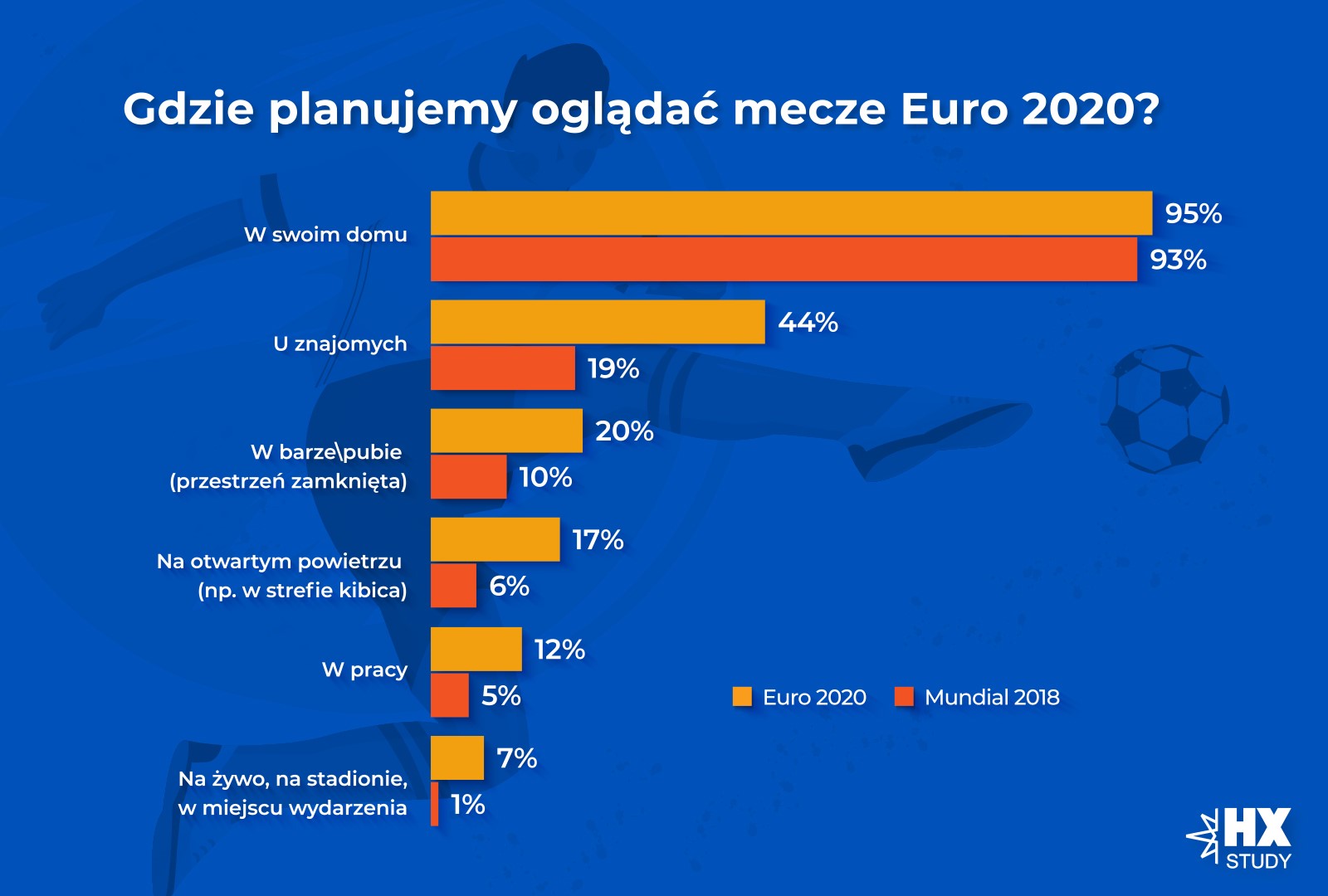 Tradycyjnie, najczęściej obejrzymy mecze we własnym domu, co nie dziwi, zważywszy na liczbę spotkań i godziny ich transmisji. Jednak prawie połowa fanów piłki nożnej zamierza oglądać mecze u znajomych i nie byłoby w tym niczego zaskakującego gdyby nie fakt, że jest to dwukrotnie więcej wskazań niż miało to miejsce w czasie Mundialu 2018 (44% vs 19% w 2018). Analogiczny wzrost dotyczy również kibicowania w barach, w czasie Euro 2020 zamierza w nich kibicować 20% respondentów, a w przypadku Mundialu 2018 było to zaledwie 10%. Natomiast trzykrotny wzrost zainteresowania zanotowało kibicowanie na świeżym powietrzu. Wygląda na to, że po roku społecznej izolacji jesteśmy naprawdę spragnieni spotkań i wspólnego przeżywania emocji sportowych.