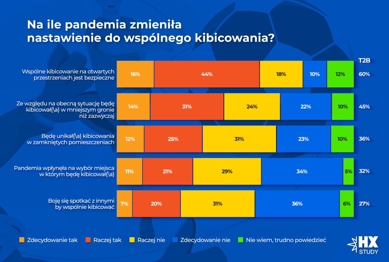 Czy jednak porzuciliśmy już wszelkie obawy dotyczące spotkań z innymi ludźmi i potencjalnego zagrożenia wirusem? Prawie połowa Polaków ograniczy grono, z którymi będzie oglądało mecze, 1/3 ankietowanych zauważa, że pandemia wpłynęła na ich wybór dotyczący miejsca kibicowania, natomiast 36% będzie unikało wspólnego kibicowania w zamkniętych pomieszczeniach. Nawet kibicowanie na świeżym powietrzu nie jest oceniane jako bezpieczne przez prawie 30% uczestników badania. Wygląda to na konflikt wewnętrzny ‘chciał(a)bym, ale się boję’. – Po roku ograniczeń mamy ogromną potrzebę wyjścia do ludzi, z drugiej strony nadal towarzyszą nam obawy dotyczące rozprzestrzeniania się wirusa. Pamiętajmy jednak, że spora grupa respondentów nie wykazuje już żadnych obaw, u nich prawdopodobnie zwycięży głód towarzyski, a odroczone o rok święto futbolu spowoduje, że będą kibicowali jak nigdy dotąd – mówi Agnieszka Jędrasik, Business Science & Strategy Manager w agencji mediowej Starcom.