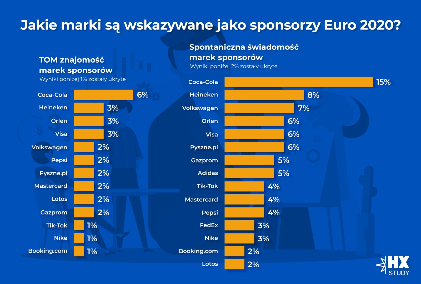 W najnowszym HX Study zbadana została również z świadomość sponsorów Euro 2020. Największą rozpoznawalność jako sponsorów tego wydarzenia ma Coca-Cola, wskazywana spontanicznie przez 15% respondentów. Kolejne marki to Heineken z 8% i Volkswagen z 7%. W rankingu znalazły się również marki, które nie są sponsorami mistrzostw, np. ORLEN, Visa, ale jak widać wieloletnie partnerstwa i akcje sponsorskie, przełożyły się na wysoka świadomość i wskazania ankietowanych również w kontekście Euro 2020.
