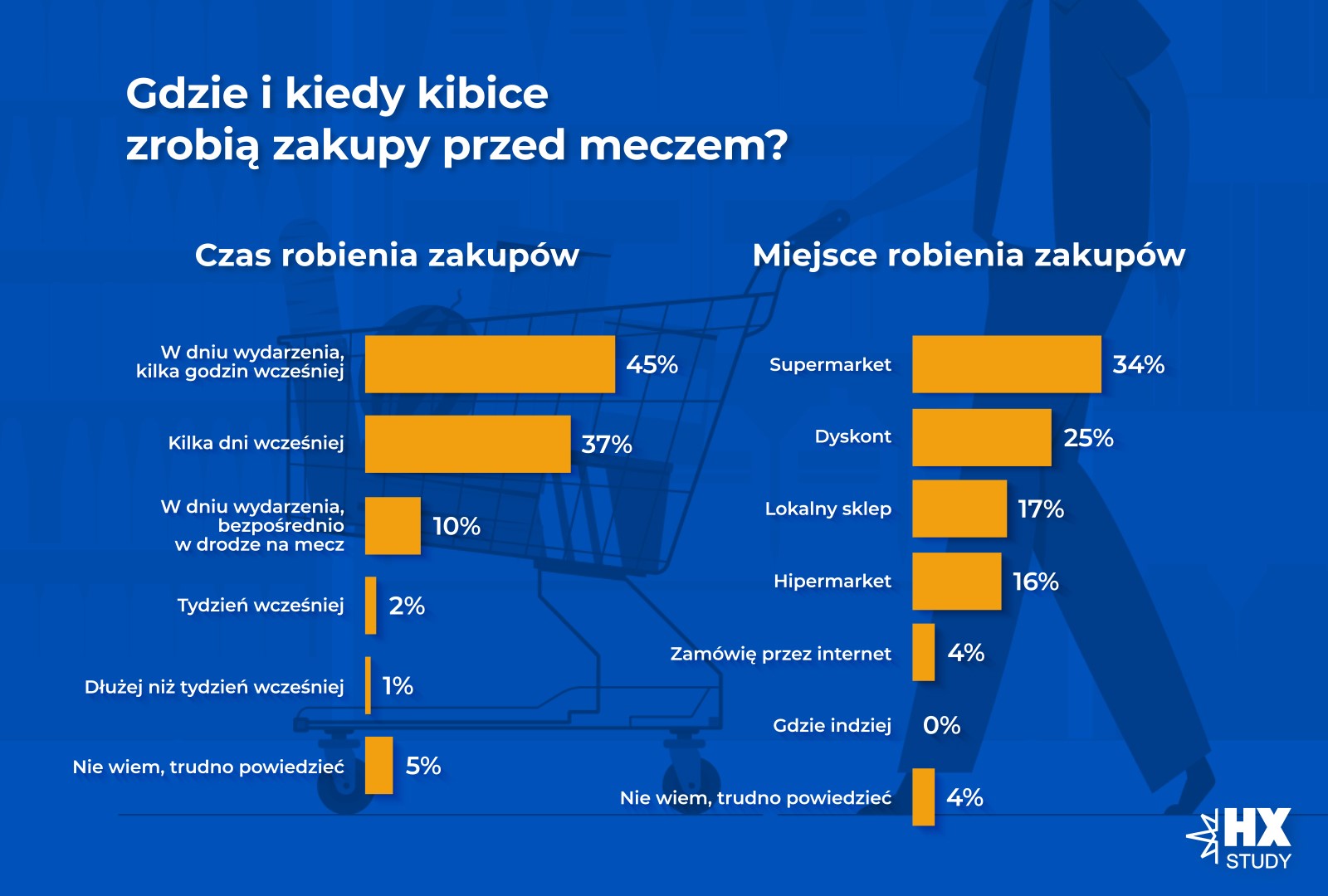 Zakupy przed meczem najczęściej zrobimy tego samego dnia. Zwróćmy jednak uwagę, na dwa ciekawe fakty: po pierwsze aż 37% respondentów wskazuje, że zrobi zakupy kilka dni wcześniej, po drugie: najwięcej osób wybierze supermarket albo dyskont, a tylko 17% wskazało lokalny sklep. Zakupy kibica nie będą więc impulsowym i spontanicznym wyborem w ostatniej chwili, będzie to zdecydowanie bardziej przemyślana decyzja.