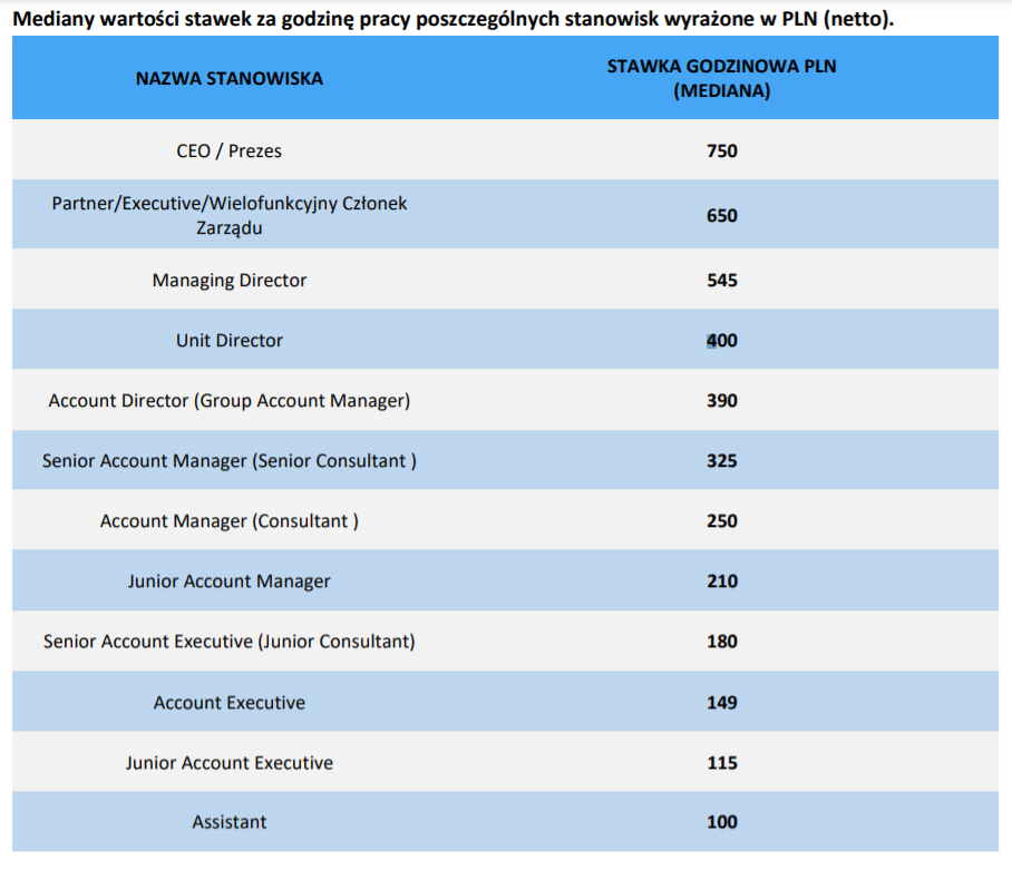 Wartości przeciętnych miesięcznych wynagrodzeń całkowitych brutto z umów o pracę (rynkowa mediana) oraz stawki godzinowe dla typowych stanowisk w branży public relations znajdują się do pobrania: tutaj.