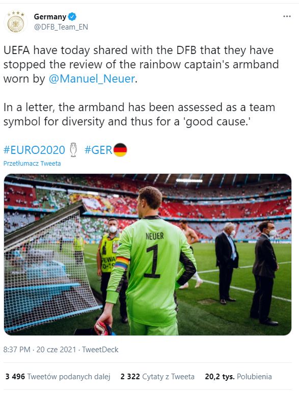 Wczoraj Niemiecka Federacja Piłkarska poinformowała, że UEFA nie ukaże jej za to, że pozwoliła bramkarzowi niemców – M. Neuerowi na występ z tęczową opaską na ramieniu. Swoją decyzję UEFA uzasadniła w dość dyplomatyczny (czytaj – wymijający) sposób, tłumacząc, nie wiadomo czy światu, czy samej sobie, że tęczowa opaska to symbol różnorodności (w domyśle – w drużynie Niemieckiej). Moim zdaniem NFP i tak wyświadczyła UEFA przysługę, nie komentując szerzej sprawy. A mogliby. Po pierwsze – stanowisko niemieckiej federacji piłkarskiej jest o wiele mocniejsze – oprócz uznania różnorodności jest także mowa o otwartości, tolerancji oraz sprzeciwianiu się nienawiści i wykluczeniu. Do tego stopnia, że w czasie środowego meczu Niemców z Węgrami, stadion Allianz Arena w Monachium ma zostać oświetlony kolorami tęczy, o co apeluje zresztą burmistrz Monachium Dieter Reiter oraz niemieccy kibice.
