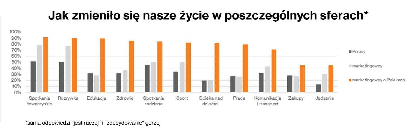 Dane z badania Wavemaker pokazują, że pandemia mogła pogłębić rozdźwięk pomiędzy stylem życia i samopoczuciem przeciętnego mieszkańca Polski a przedstawicielami branży reklamowo – marketingowej, zamieszkującymi głównie Warszawę. Różnice te prawdopodobnie przełożyły się na błędne postrzeganie kondycji Polaków przez marketingowców. Ci ostatni znacznie mocniej narzekali na ograniczenia związane z wyjściami do restauracji czy barów, bardziej brakowało im wyjazdów na wakacje i ferie oraz spotkań towarzyskich. Pytani więc o to jak zmieniło się życie w poszczególnych sferach, nawet mocniej przypisywali swoje tęsknoty przeciętnym mieszkańcom Polski. Największy rozdźwięk pomiędzy tym, co myślą o Polakach marketingowcy, a jak postrzegają to sami Polacy, widać na polu życia towarzyskiego, rozrywki i edukacji.