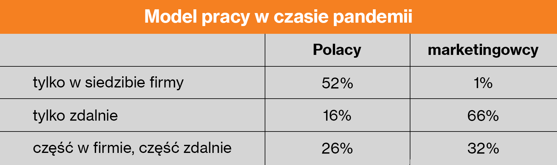 Niemal każdy marketingowiec (95 proc.) spędzał wskutek pandemii więcej czasu w domu, średnia wśród polskich internautów wynosi zaś 60 proc. Ma to związek z modelem pracy – zaledwie 1 na 100 marketingowców pracował w czasie pandemii TYLKO w siedzibie firmy, a 66 proc. robiła to tylko z domu. Z kolei wśród badanych Polaków nieco ponad połowa pracowała WYŁĄCZNIE z biura.