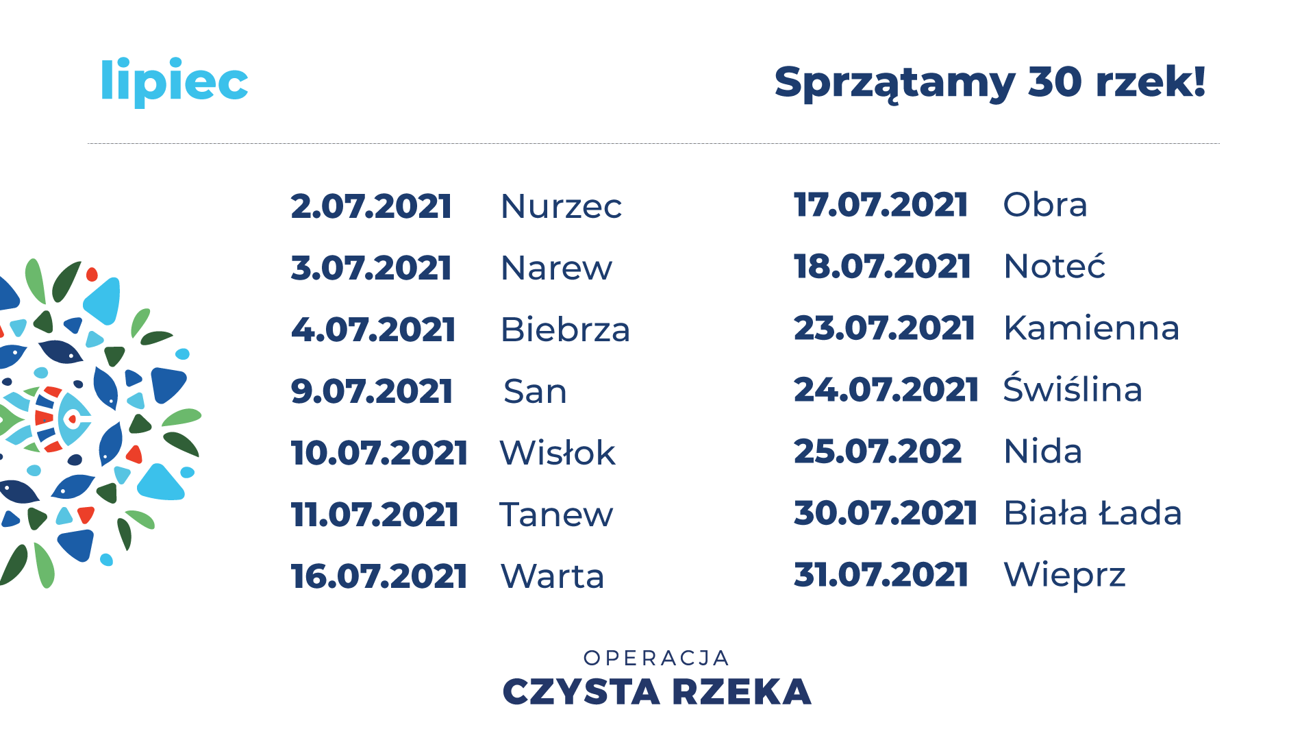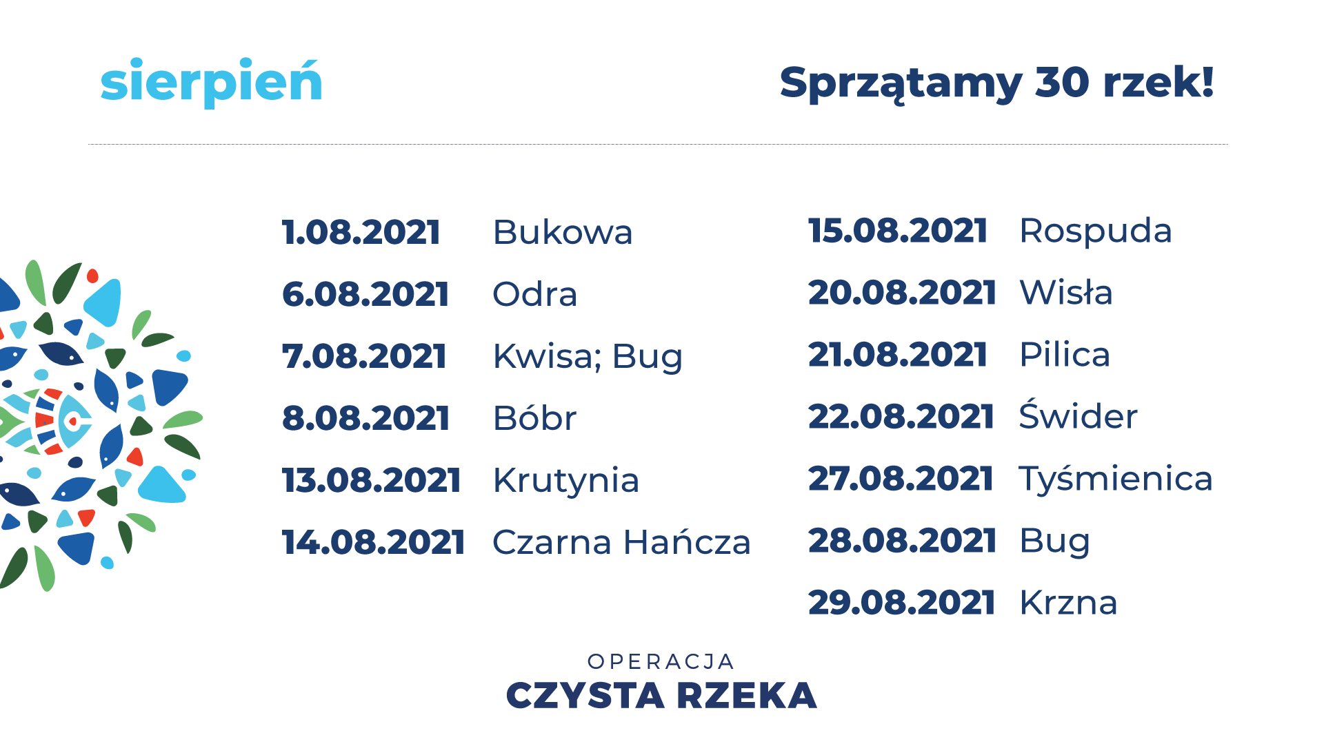 Akcje sprzątania rzek i okolic w ramach Operacja Rzeka 2021 ruszyły 22 marca z okazji Światowego Dnia Wody. Tego dnia Sztab Główny zorganizował porządkowy spływ rzeką Bug na odcinku Drohiczyn – Bużyska. Od tego czasu niemal przez cały miesiąc odbywały się akcje sprzątania w różnych regionach Polski. Finałowe porządki odbyły się 17 kwietnia. Wtedy zorganizowano 202 akcje sprzątania, w których udział wzięło 3076 wolontariuszy .