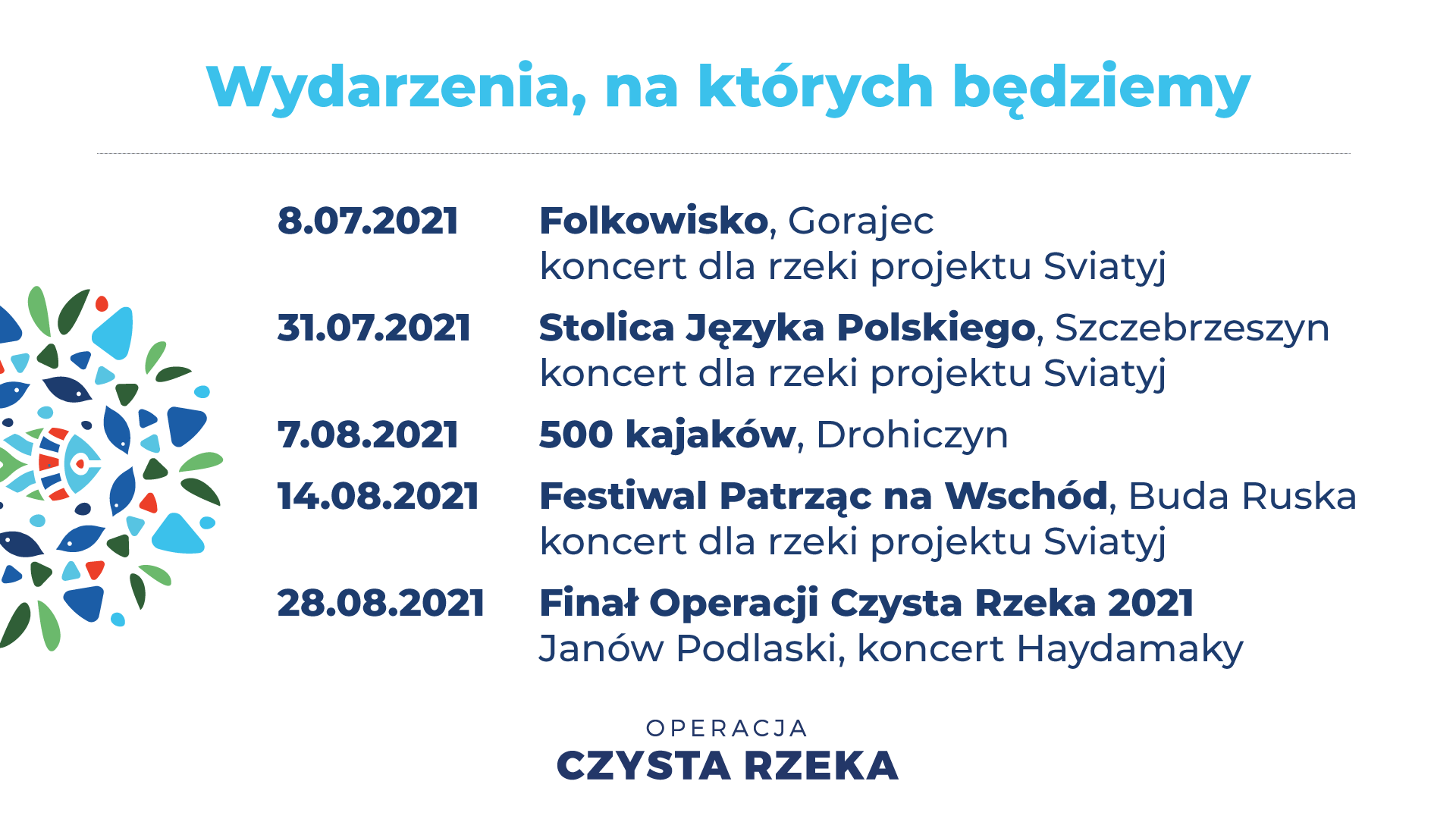 – Będziemy na Festiwalu Kultury Pogranicza Folkowisko, Festiwalu Języka Polskiego w Szczebrzeszynie i Festiwalu Patrząc na Wschód w Budzie Ruskiej, a także podczas spływu „500 kajaków” w Drohiczynie. Finał akcji odbędzie w Janowie Podlaskim. Na tych wydarzeniach będą organizowane 20-osobowe sztaby, które będą sprzątać w godzinach porannych. Wieczorami zaś będą odbywały się koncerty dla rzeki projektu Sviatyj – solo, duet lub trio, a w Janowie wystąpią Haydamaky – wyjaśnia Daniel Parol, jeden z pomysłodawców i organizator Operacji Czysta Rzeka.