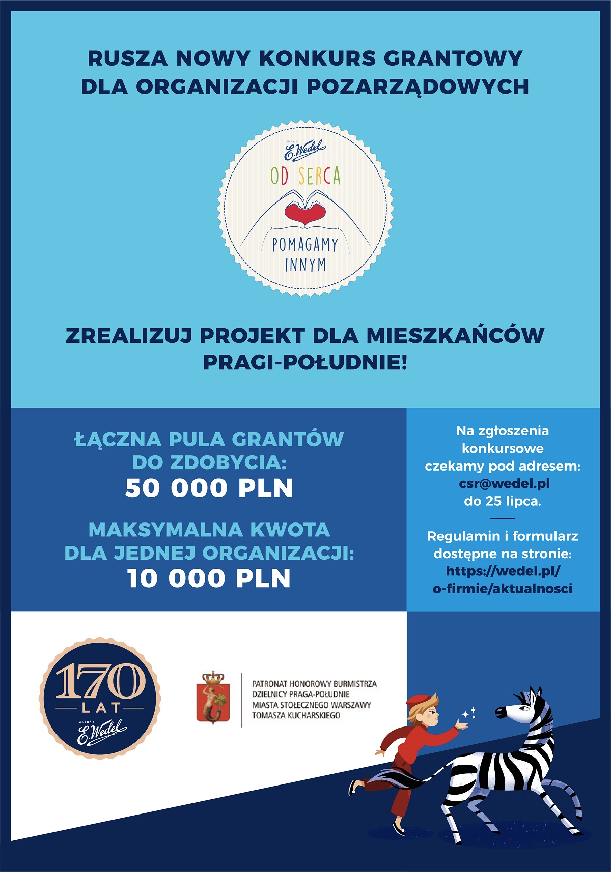 Konkurs to sprawdzona formuła, którą od 14 lat z sukcesem realizowano wewnętrznie, angażując załogę do wspólnych działań dobroczynnych. W roku jubileuszowym po raz pierwszy do zgłaszania inicjatyw zaproszono nie tylko pracowników Wedla, ale także lokalne fundacje i stowarzyszenia. Działania powinny być skierowane do mieszkańców Pragi-Południe, gdzie od lat 30. XX wieku mieści się siedziba firmy.