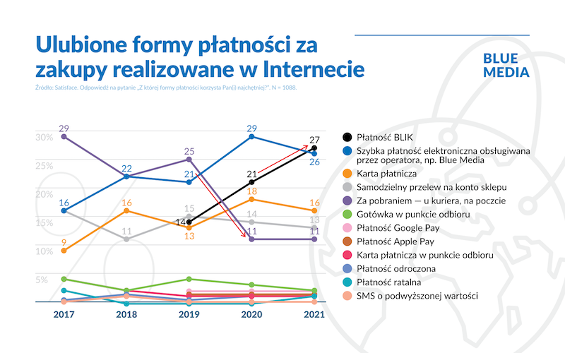 Coraz chętniej Polacy wybierają BLIKA, który obecnie jest najczęściej preferowaną metodą opłaty zakupów internetowych (27 proc.). Niewiele mniej popularną formą są szybkie płatności elektroniczne, które wybiera 26 proc. respondentów. Płatność kartą płatniczą jest z kolei ulubioną metodą zapłaty dla 16 proc. kupujących w sieci – dowiadujemy się z badania Blue Media.