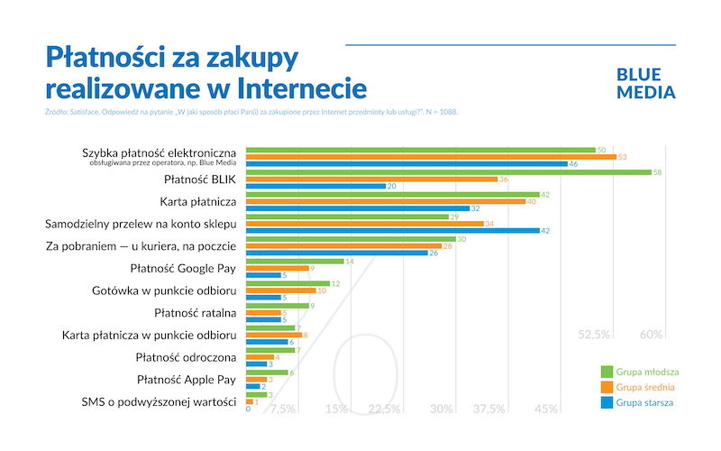 Wciąż najwięcej, bo aż połowa płatności za zakupy w sieci odbywa się za pośrednictwem szybkich płatności elektronicznych (tzw. pay by linków). Tę metodę preferują przede wszystkim obecni 30- i 40-latkowie. BLIK, którym w internecie regularnie płaci już 39 proc. Polaków, wybiera młodsze pokolenie. Najmłodsi respondenci wyraźnie częściej od innych grup wiekowych preferują także płatności Google Pay (14 proc. wskazań). Najstarsi preferują przelewy tradycyjne, które jednak tracą z roku na roku na popularności.